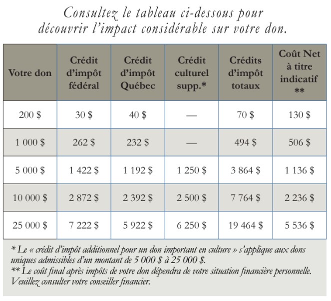 * Le « Crédit d’impôt additionnel pour un don important en culture » s’applique aux dons uniques admissibles entre 5 000 $ et 25 000 $.