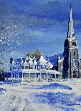 Cette magnifique carte présente une reproduction d’un dessin de l’artiste Marie Villeneuve. L’œuvre capture l’église historique Saint-Joachim et le presbytère dans le calme d’une soirée d’hiver, leurs silhouettes familières transformées par un manteau de neige.