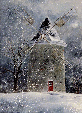 This card features a reproduction of a drawing by artist Marie Villeneuve that captures the enduring presence of the Pointe-Claire Windmill in winter. The historic stone tower stands firm against a flurry of snow, evoking a sense of history and resilience.