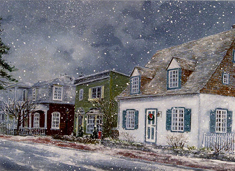 This beautiful card features a reproduction of a drawing by artist Marie Villeneuve. The artwork captures the cozy charm of a winter’s day in the village, with historic homes nestled under a soft blanket of snow.